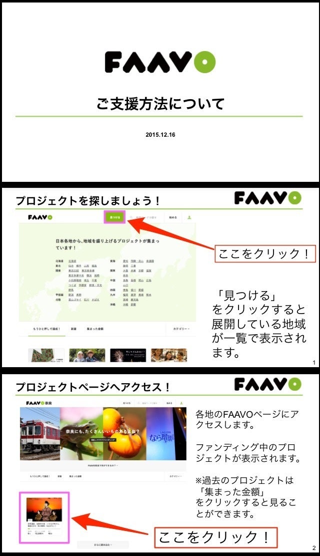 2016/11/16 18:29ご支援方法の大まかな流れとしては、下記になります。 1【FAAVO会員登録】 FacebookアカウントまたはTwitterアカウントまたはメールアドレスから登録↓ユーザーIDなどを指定↓指定したアドレスに登録完了メール 2【支援方法】 FAAVOログイン後、希望する支援を選択↓個人情報入力(お届け先など)↓決済方法選択↓決済手続き 【クレジットカードでのご支援方法】 もっと見る