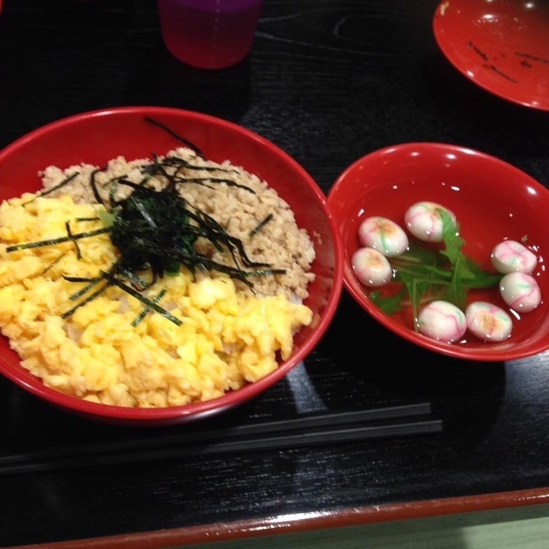夕食は鳥挽肉と卵の丼と美味しいお吸い物でした。