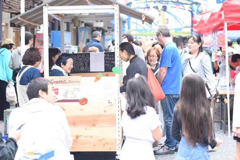 きっかけを作ってくださったのは、商店街の老舗の「今井かまぼこ店」の今井さん。商店街の理事会の方々や区役所の方々など色んな人たちを繋いで頂き、お祭りの時に屋台を出したり、夏休みには映画館とコラボしてアニメお菓子作りワークショップをやったりと商店街での活動にも関わらせて頂きました。