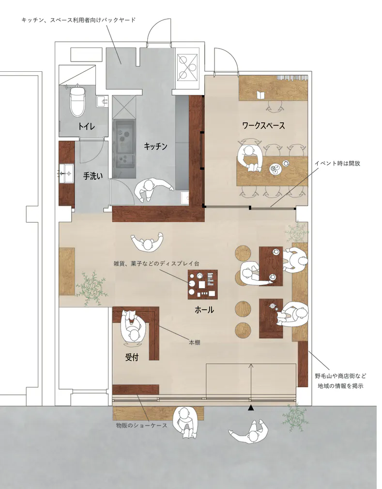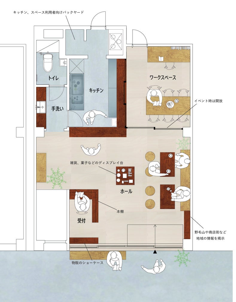 またホール部分には展示や雑貨を販売したい人向けに開放し、ワークショップや打合せにも使える場所として設えます。週末には映画上映会やフリーマーケットなどのイベントも行う場所になります。