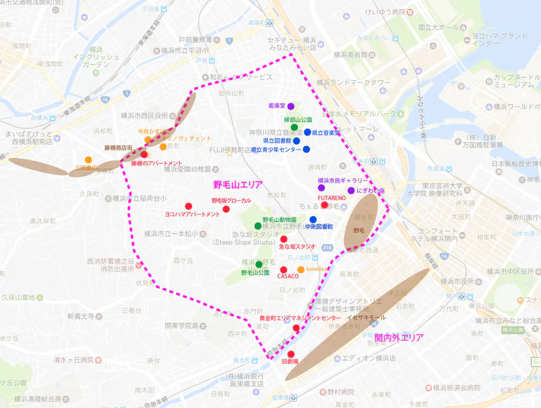 (野毛山エリアにある拠点や公共施設をプロットしたもの。野毛山ミーティングの資料より)