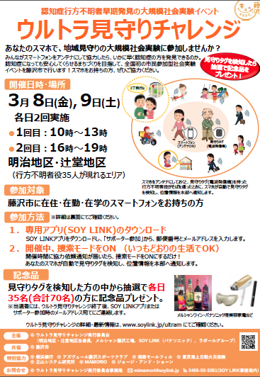 どうも! 大澤です。 本日は3月8日・9日に開催される「ウルトラ見守りチャレンジ」のお知らせをさせてください! 本イベントは全国初の市民参加型社会実験イベントです! 藤沢市近辺に在住・通勤・通学の方はどなたでも参加可能。 イベント当日、その近辺に「いる」だけで特別な行動はいりません。 皆さんのスマートフォンをアンテナにして、いかに早く認知症の方を発見できるのかのロールプレイとなります。 参加記念品もあり! 以下、詳細はチラシをご覧ください これまで明治地区にて行方不明者捜索訓練「明治見守りチャレンジ」を2年間かけて6回行ってきました。 この度、さらに多くの方に関心を持ってご参加いただくために、範囲を拡大して実行委員と藤沢市の共催で本イベントが開催されます! アズヴェール藤沢は特別協力という形で携わります。 当日は主な捜索地点にTOPチームの選手が出没!? 是非多くの方にご参加いただけると嬉しいです。 ご参加といっても、「SOYLINK」というアプリをダウンロードしただき、「捜索モード」という機能をONにしてもらえれば、後は辻堂・明治地区を散策してもらえるだけでOKです。 例えば湘南モールフィルやテラスモールにお買い物に行くだけでOK! 全国的にも注目されているイベントです! みんなで積極的に参加し、社会問題解決の一歩を踏み出しましょう!