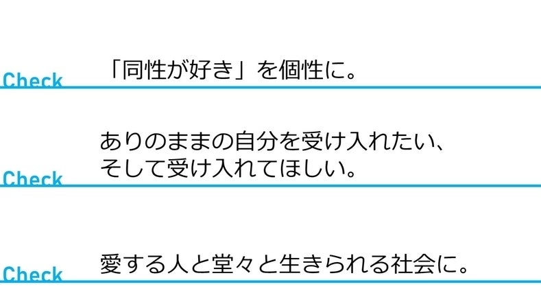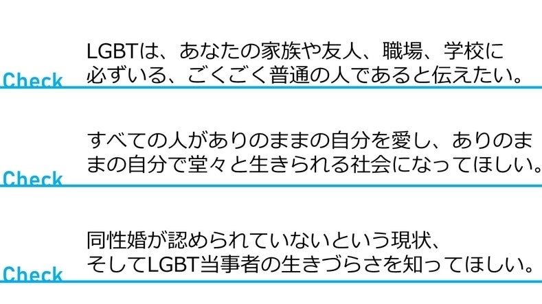 また、LGBTであるということを個性と捉え、お互いの個性を認め合うことができたら、多様性を認め合う社会になると信じています。