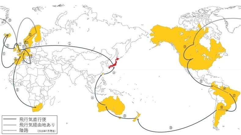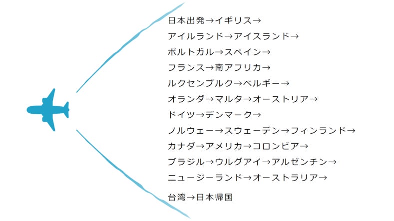2019年3月に出発し、2019年9月の間で26ヶ国を巡ります。西回り航路でヨーロッパ方面から順に、飛行機または陸路でアクセスしやすい国を周る予定です。