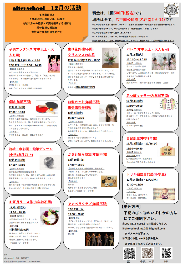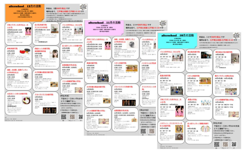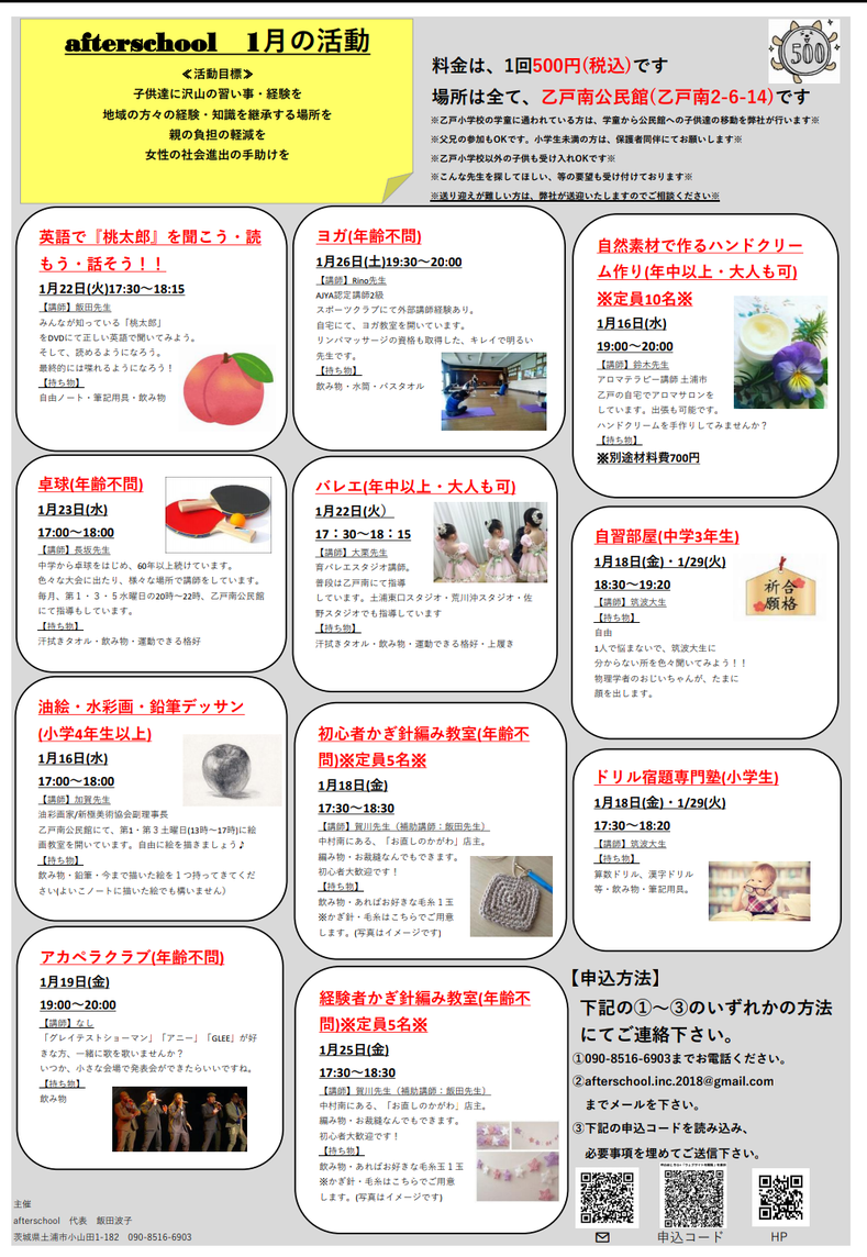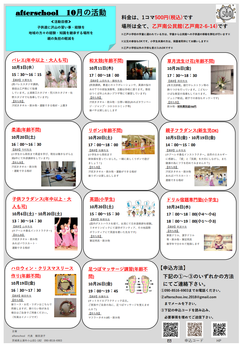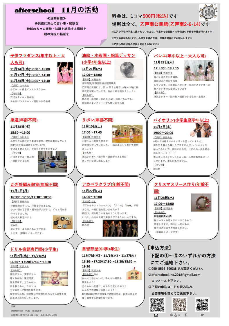 それならば、講師を学校の近くに呼び、1回500円という低料金で様々な習い事ができるように、この事業(afterschool)を立ち上げさせていただきました。