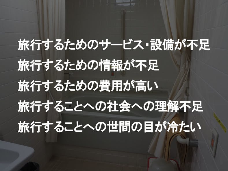 このデータは要介護者の人の旅行するときの問題点として2016年国土交通省の調査研究からわかっています。