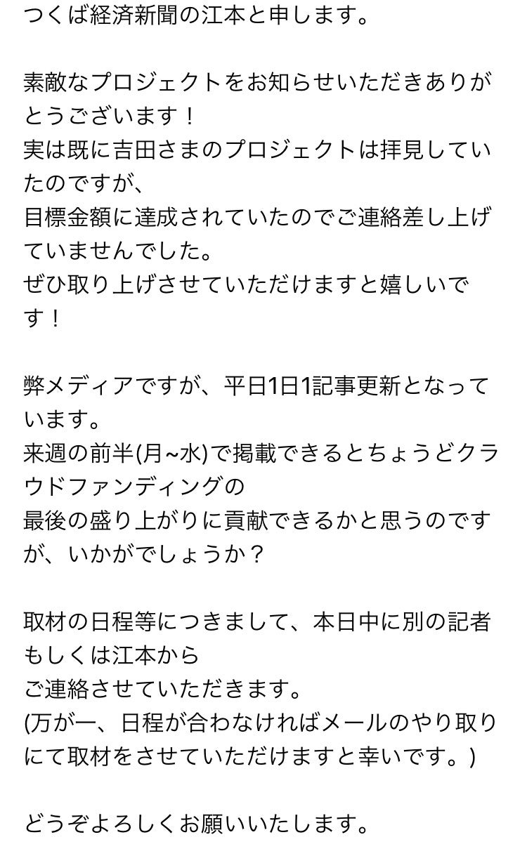 2019/02/27 20:23先日、つくば経済新聞さんにベィmagazineを取材してもらいました!! むしろ吉田から頼み込みました! 「すいません、取材してください笑!これこれこんな企画やってるんです!!」って。 そしたら とすぐに返事をいただきました!! つくば経済新聞さん、ありがとうございます^_^ 今週の月曜日に掲載されてつくば経済新聞アクセスランキング1位となり注目が集まりました!! 僕らはまだまだ泥臭くいきます! 人脈もお金も広告力もないからこそ。 人に会って少しずつ認知してもらいます。 明日でクラファンは終了。 と同時にスタートです。 なにも失うものがないからこそ走れます。 ぜひ最後の日にシェアしていただけると嬉しいです。 よろしくおねがいします!! もっと見る