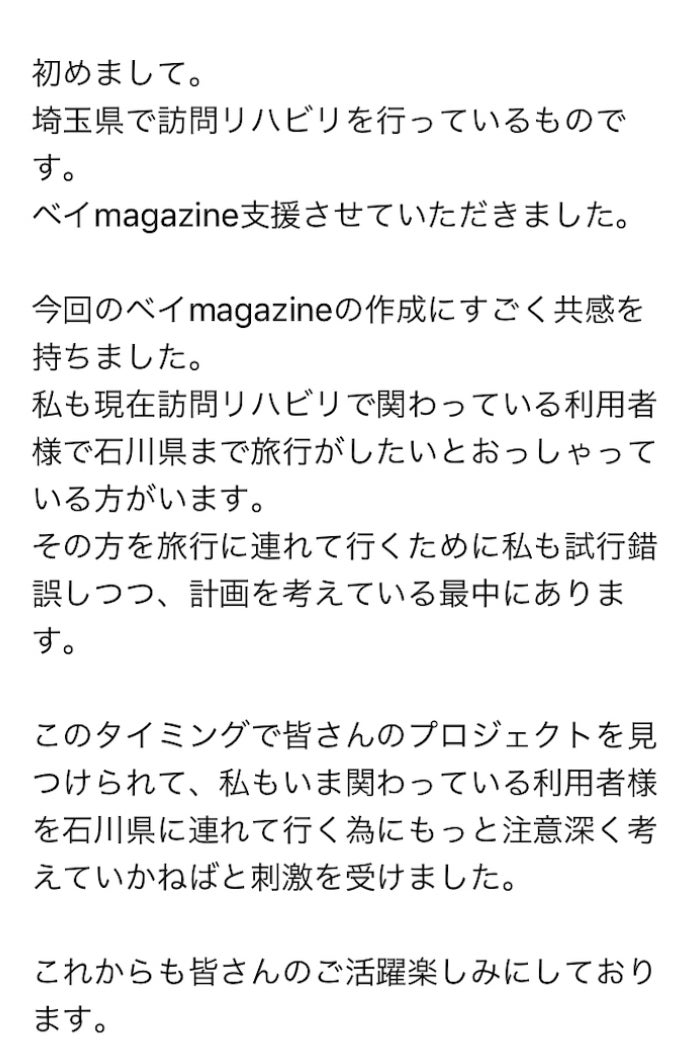 もし支援金が余れば次回ベィmagazineの広告、作成費用に回していきます。