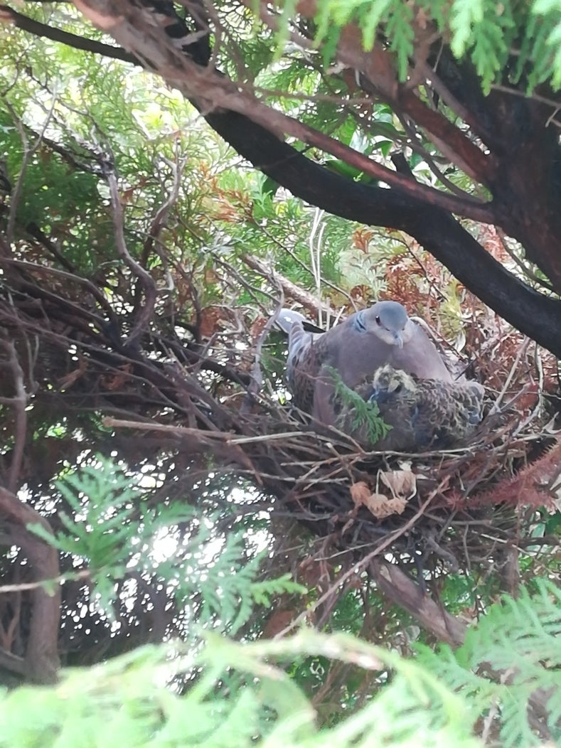 また、小さな園庭のこれまた小さな木に鳩の巣を発見。