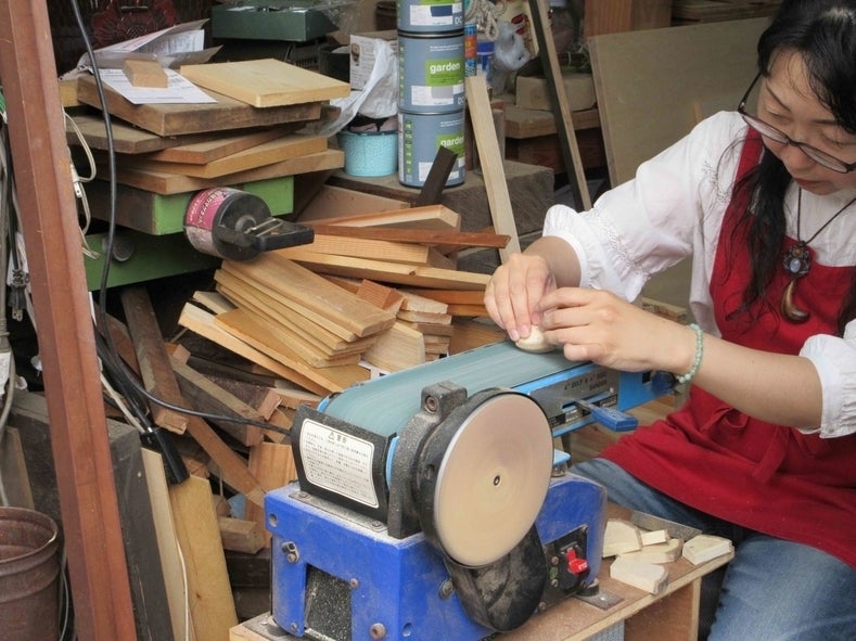 いろいろな形にするべく、マクラメ編み講師のmerciさんが、面白い形を切り出していきます。研磨機で面取りをして、ぶら下げるための穴を開けて。