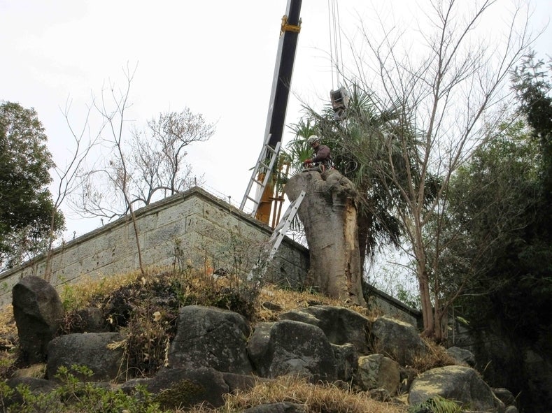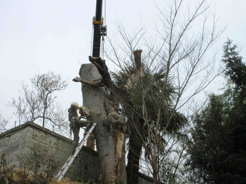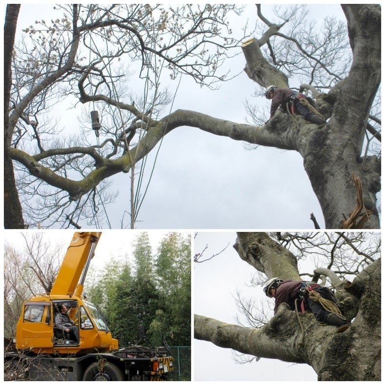 空師が木に登り、クレーンのオペレーターと相談しながら、ワイヤーをかけ、枝の根元にチェーンソーを入れて伐り、クレーンで吊って移動させます。