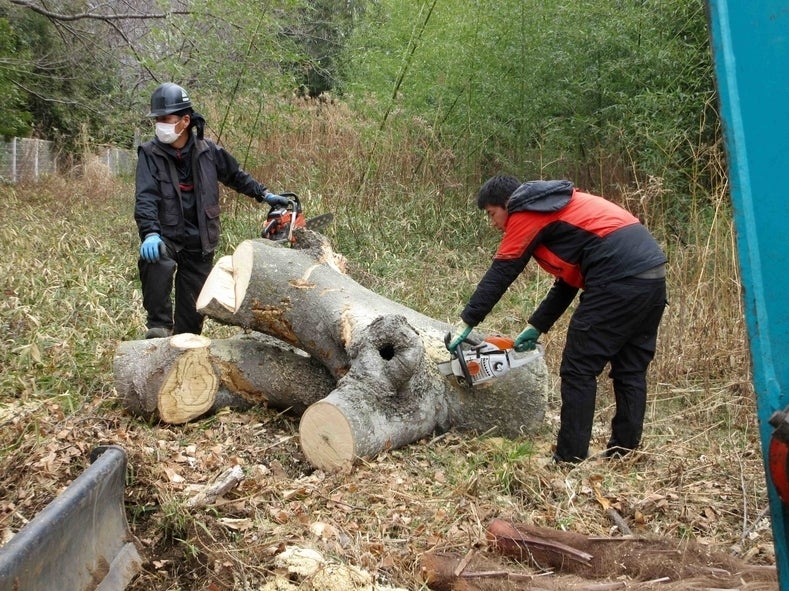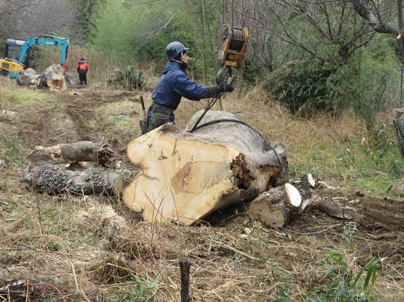 伐採する空師(そらし)の方と、重機を操作する方と息を合わせて吊り伐りしていきます。