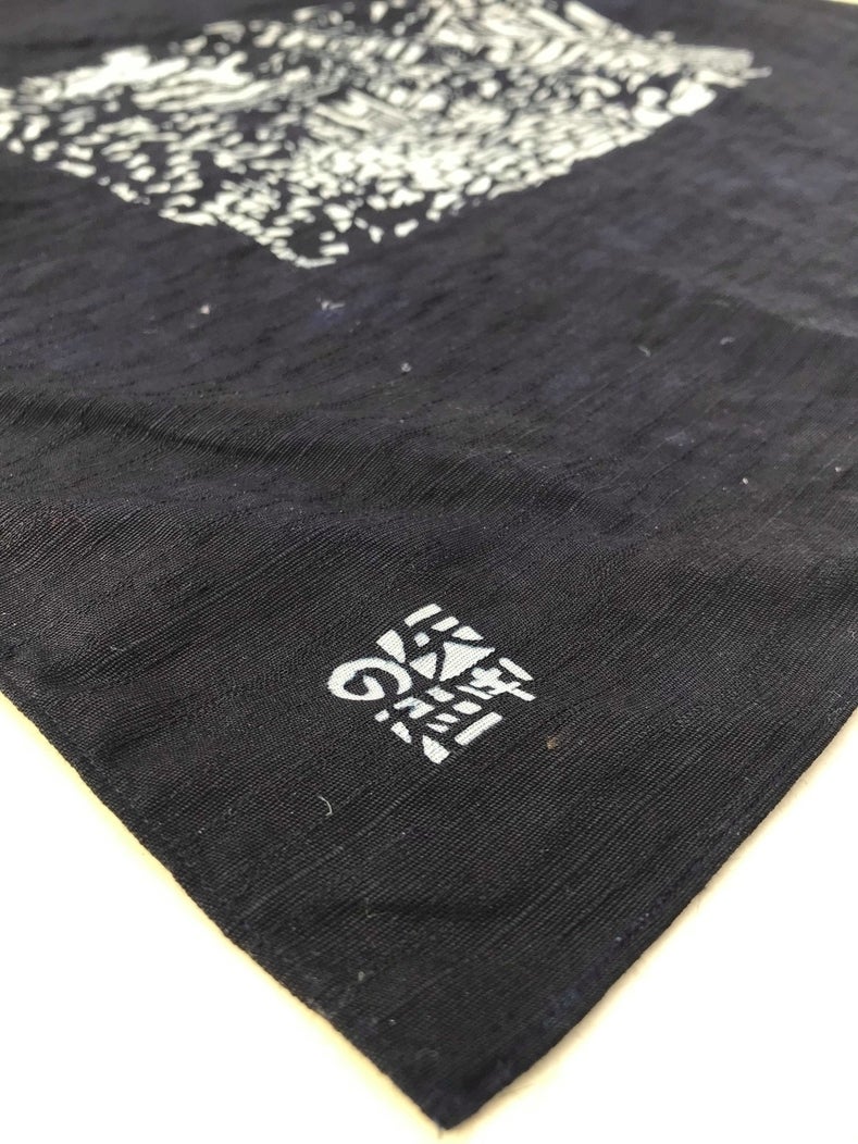お二人目、染めを担当したのは草木染め工房ぷにの家さん。矢中の杜でもいつも楽しい染めのワークショップを開催してくださっています。竹蓋さんの作品をぷにの家の工房に持ち込んで、ご相談したところ、やりましょうと快諾していただき、藍染の地に抜染(ばっせん)という手法で小風呂敷に仕立てられました。