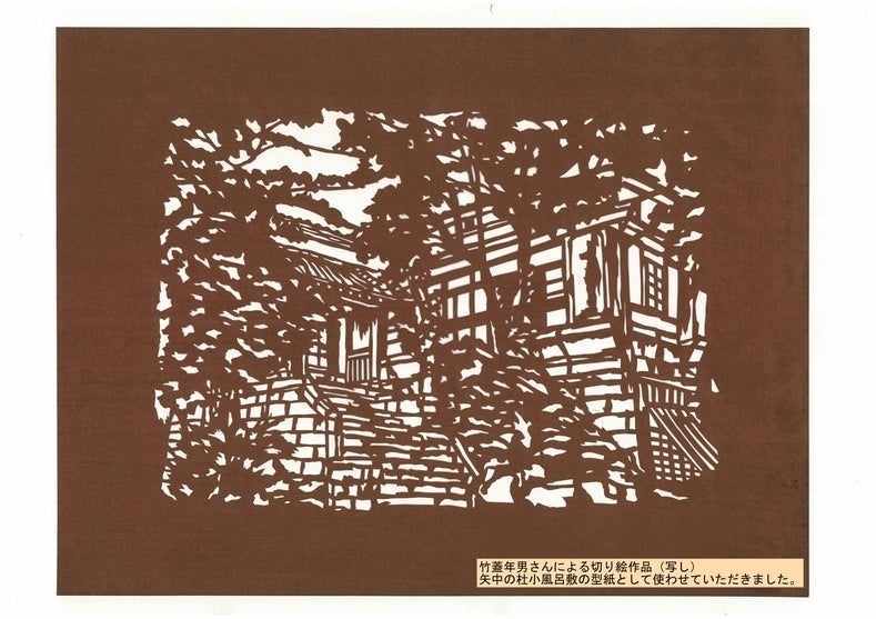 お一人目は、切り紙作家竹蓋年男さん。真壁のひな祭りなどこれからも残していきたい地域の風景を切り紙作品にしておられます。その切り紙作家竹蓋さんが、2014~16年まで矢中の杜で開催されていた「手ぬぐい展」をきっかけに、矢中の杜の切り絵作品を寄贈してくださいました。染めにも使えるようにと柿渋紙で作られた作品です。