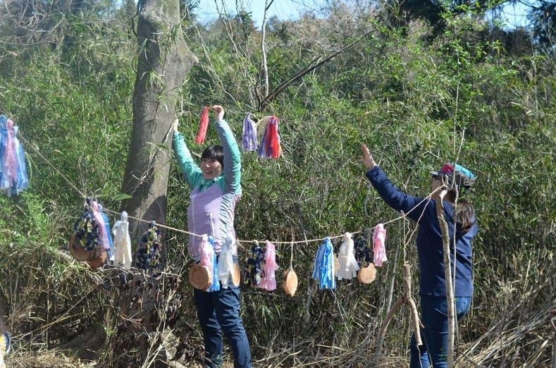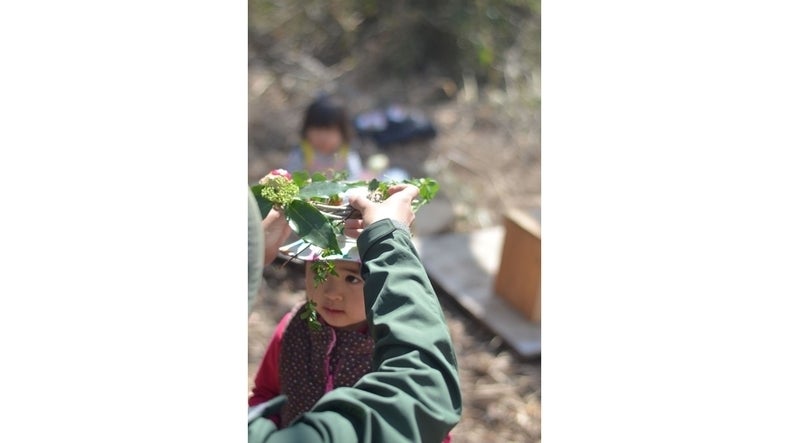 保護者さんお手製のブローチが付いたツタ冠の贈呈と、みんなが森の中で拾った宝物のを入れられるさまりー手作りのバッグをプレゼントしました。