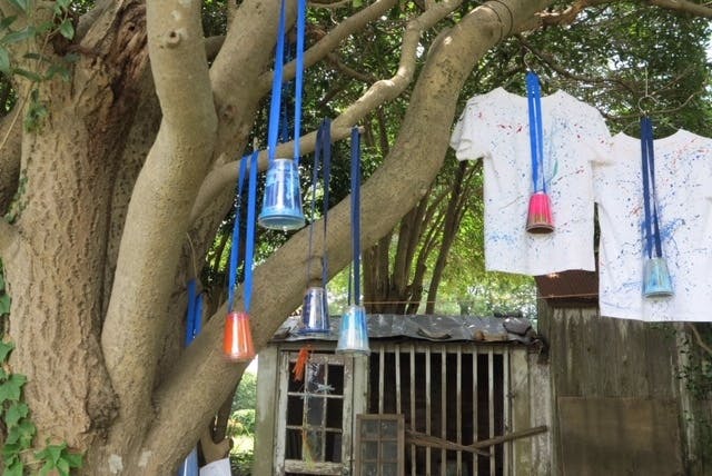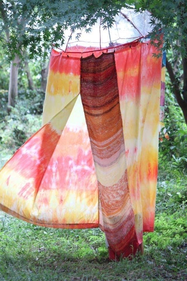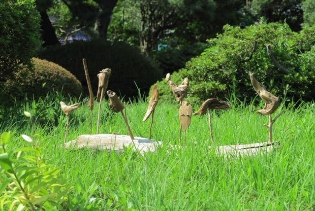 庭園内の植栽を使っての作品展示は、樹木からつるしたり立てかけたり根元に置いたり。またある時は風にゆれたり雨にぬれたりします。作品のジャンルは問わず、絵画・彫刻・染織・陶芸・写真など、自由な発想による作品の展示が可能です。