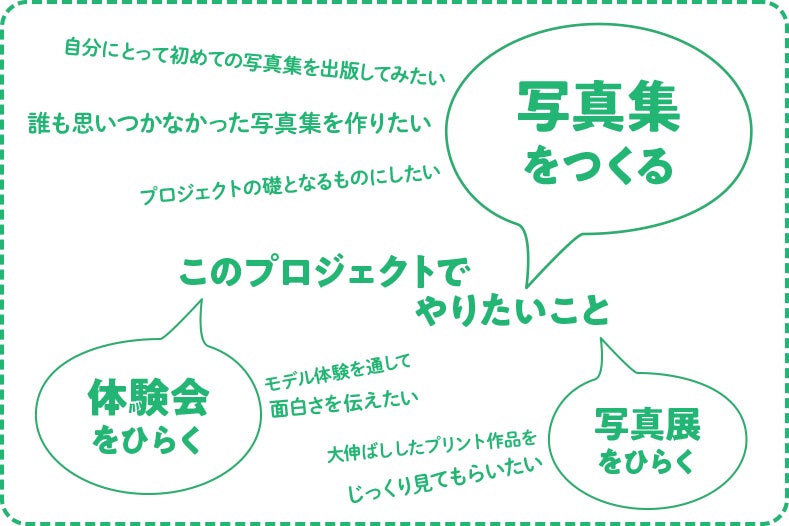 前の段落にも記述しましたが、プロジェクトの「秘めた可能性」を具現化していきたいのです。まずは写真集の発行が目的ですが、このプロジェクトを広く知ってもらい、応援してくれる仲間を増やすためにクラウドファンディングのシステムを活用します。