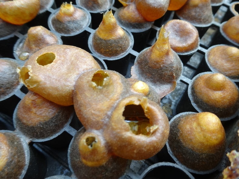 針なしミツバチはなんとも不思議な貯蜜ポット(蜂の巣の一部)を作ります。
