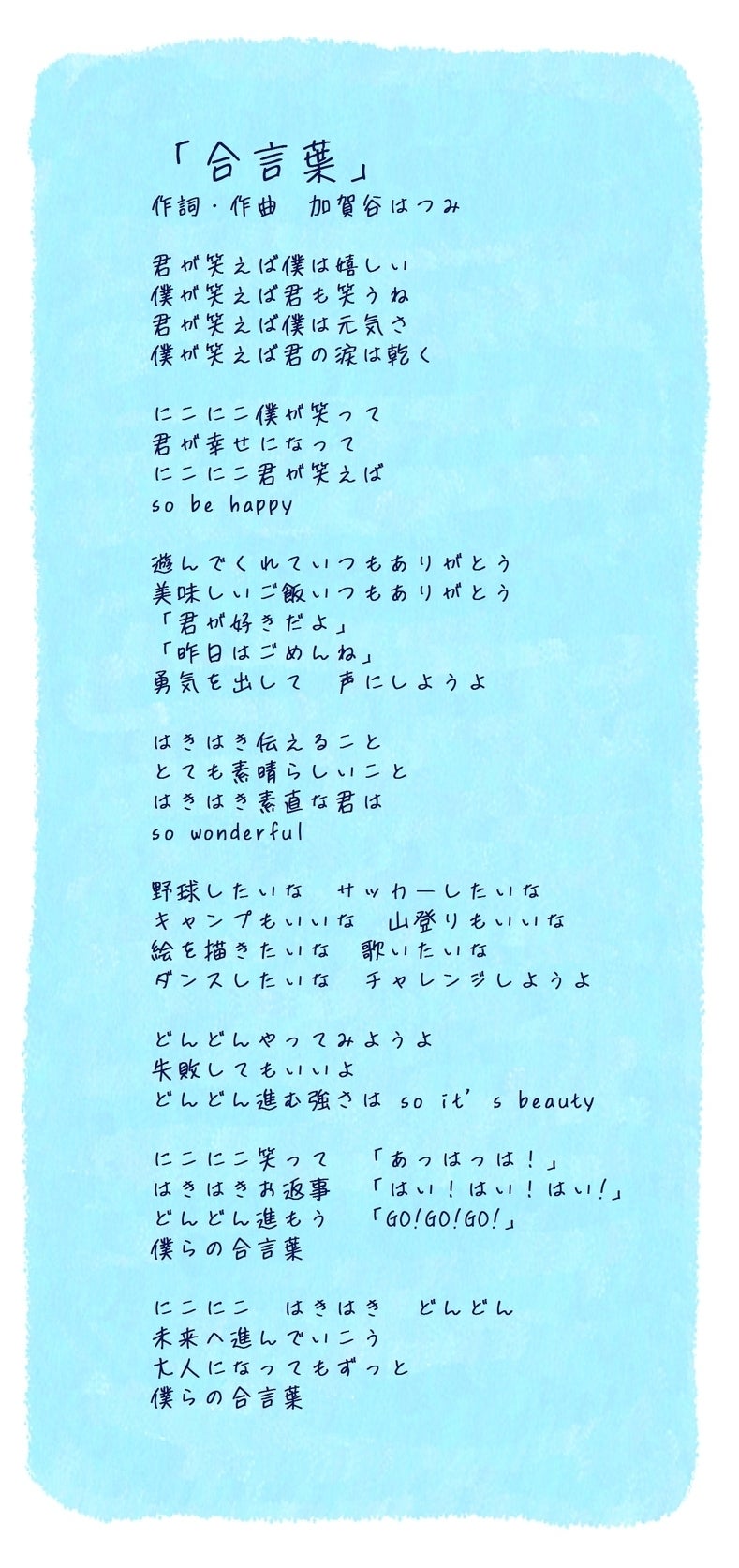以下、加賀谷はつみさんからの直筆メッセージ&「合言葉」歌詞です。