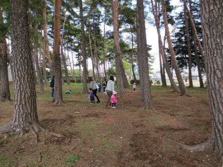 子どもたちと松ぼっくりを探したり、大きな葉っぱをさがしたり、緑色のカードを持って、同じ色の草花を探したり・・・。
