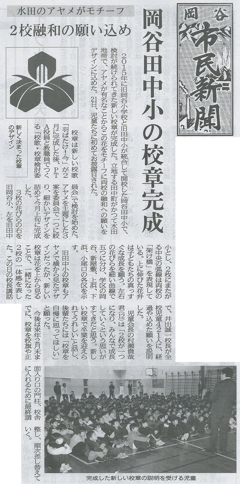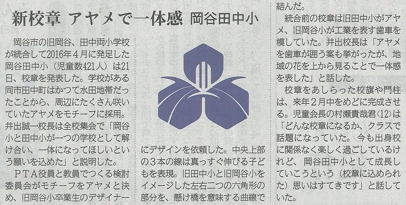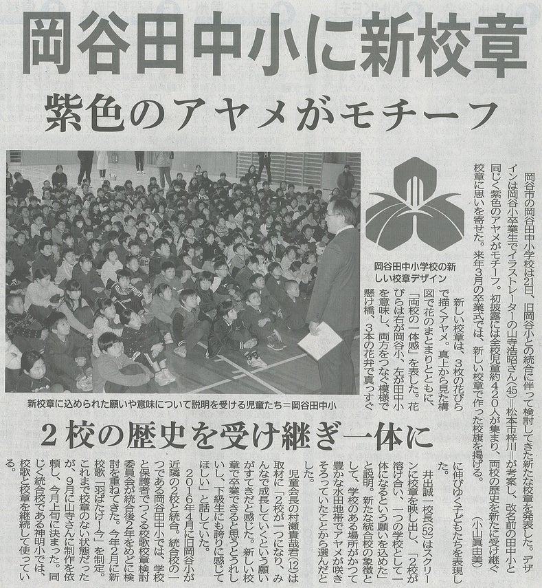 12月22日(金)付の各地元紙にて、岡谷田中小学校の新しい校章について記事が掲載されました。デザインを担当されたのは、岡谷小OBの山寺さん。以前のレポートでもお知らせしましたが、岡谷小閉校にあたって、様々なイラストを製作されたデザイナーです。