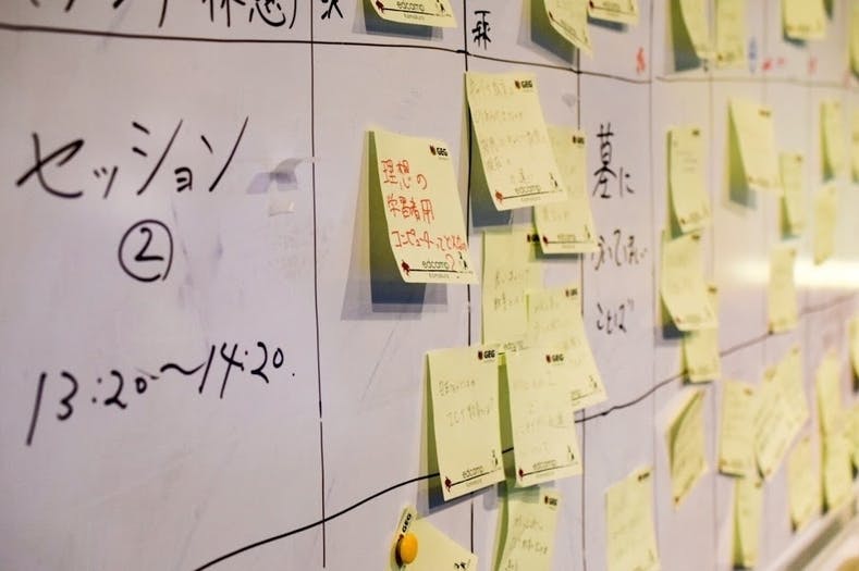 edcampでは、集まった参加者が、語り合いたいトピックをその場で考え、セッションボードに貼りだしてその日の予定を決めていきます。