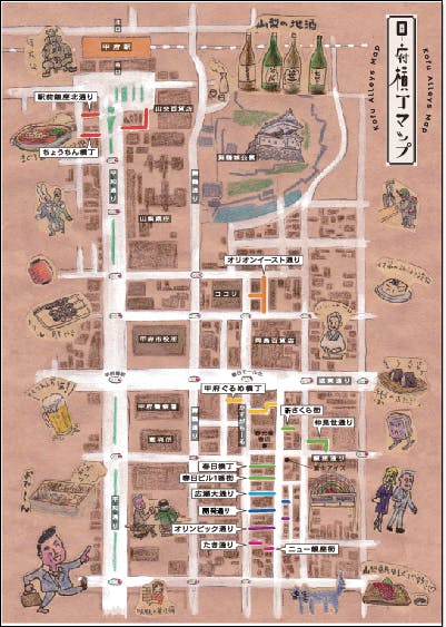 甲府中心市街地には、どこか懐かしく、また、優しさがあふれながらも、猥雑性やいかがわしさも持ち合わす空間、いわゆる「そこの人たちの生活」を体験できる場所が存在する。それが現在でも多く残っている「横丁」なのである。店は狭くて不便ではあるが、肩が触れ合う狭さのおかげで、気軽に話せる雰囲気や温かさがある。隣に座った見ず知らずの人と気軽に会話が出来るのも、横丁店舗ならではで、訪れたお客さん同士、またお客さんと店主の間に、コミュニケーションが広がるなど、決して郊外の店舗ではまねのできない「そこにある生活空間」という独自の文化を持っている。