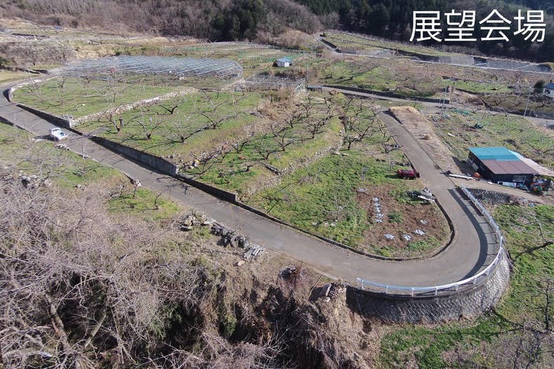 甲府盆地の展望が望める会場。斜面に面した展望キャンプ会場では4月の桃の花の時期にはピンク色の絨毯の景色が望めます。また夜には甲府盆地の夜景も望めます。きっと思い出の景色になるはずです!
