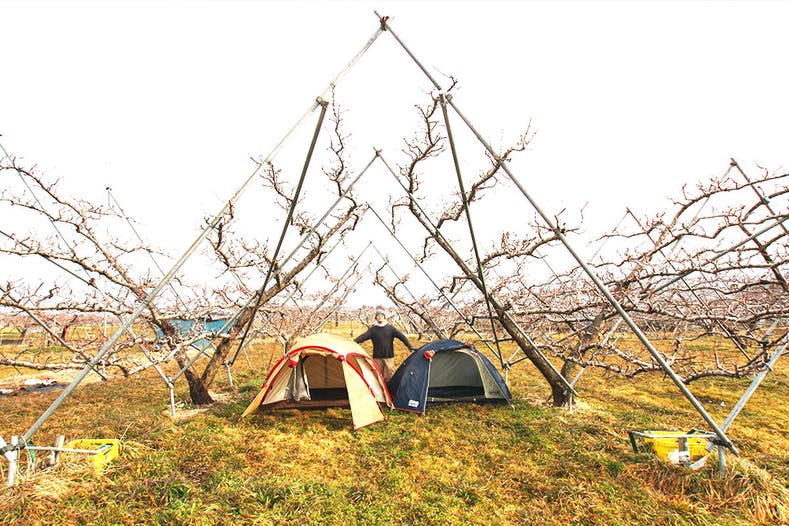サイズ感が分かりづらいというありがたいいご指摘をいただいたので、農園にテントを設営してみました。