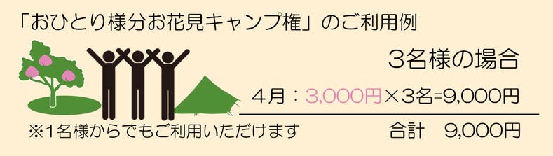 支援コース 『おひとり様分お花見キャンプ権』3,000円で4月開催PFCに『おひとり様1回』ご参加いただけます。 ※農園カフェ会場限定