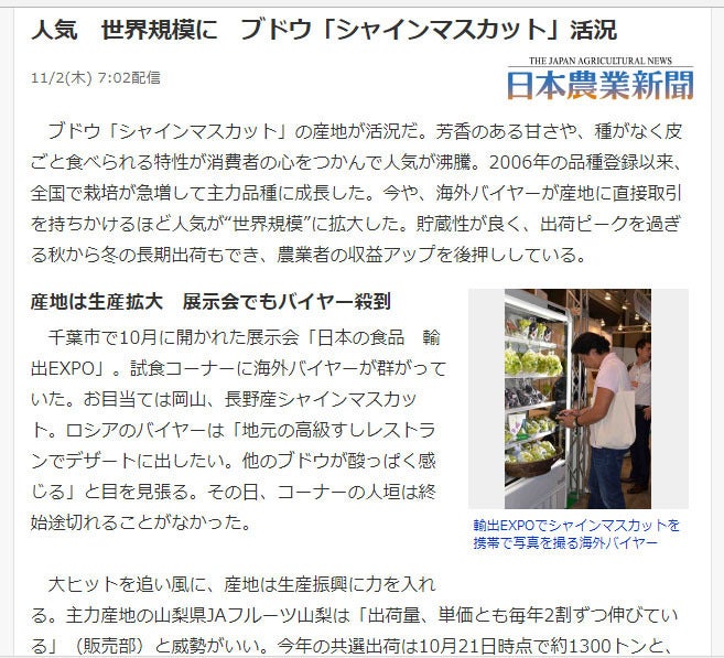 • 来年度、私が所属している若手農家グループ「東仲倶楽部」で 地元の小学校にて小学3年生向けに「食育」の授業を行うことになりました。   たまたま私の借りている葡萄畑が小学校のグラウンドの真ん前にあり、 その畑で、生育状況の観察や農作業体験、そして収穫期には いくつかの葡萄を味わっていただこうという授業です。   先週、教頭先生をはじめ先生方と打合せをして、 5月と9月に行うことになりました。   地元で育つ果物は、世界で注目されているんだよ! なかなか市場に出回らない品種もあるんだよ! それが目の前で食べられるんだよ!   ってなことが上手に伝われば良いな、と思っています(^^;     (シャインマスカットと兄弟の紫の葡萄「オリエンタルスター」の木です)   シャインマスカット、ピオーネ、オリエンタルスター、山梨で生まれた赤い葡萄の「紅環(べにたまき)」、マスカットオブアレキサンドリア等がこの畑には植えてあります。         もっと見る