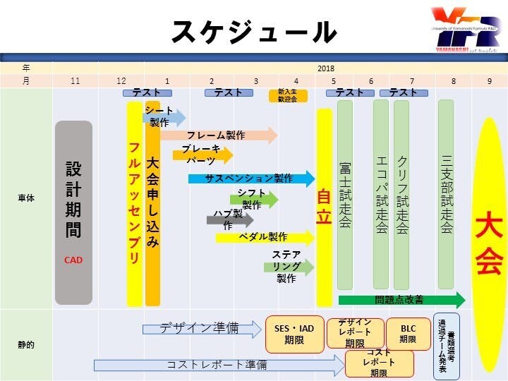 今年は「車両と人との対話」をコンセプトに操作性の向上、軽量化、整備性の向上を目指して製作し、車両の熟成を行っていきます。また、スケジュール管理を徹底させることによって、車両の静的審査にも力を入れチーム初のトップ10入りを目標として活動して参ります。