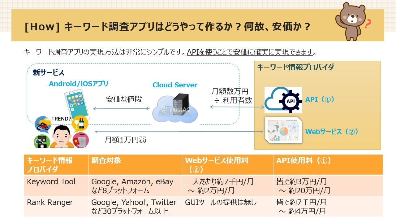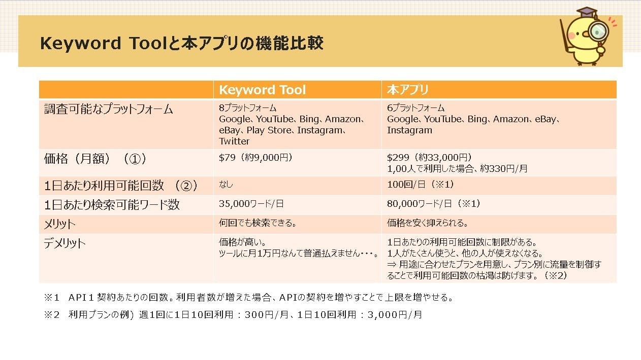 ・Keyword Tool APIは月額 約220,000円/月で1日800回使用できますので、例えば本アプリを100人で1人当たり平均8回使用する場合、1人あたり約220円(約220,000円 ÷ 100人)でキーワード調査アプリを利用できます。
