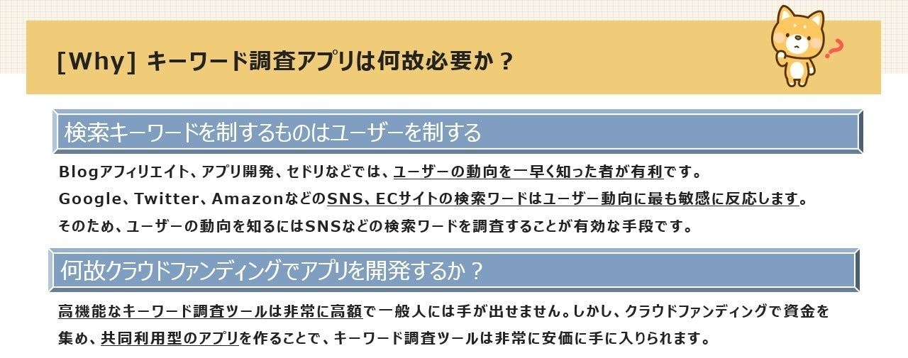 そこで、もっと安価にキーワード検索を行う方法は無いものか?と考えたところ、共同利用型のアプリを作ることに思い至り、当プロジェクトの発案を致しました。