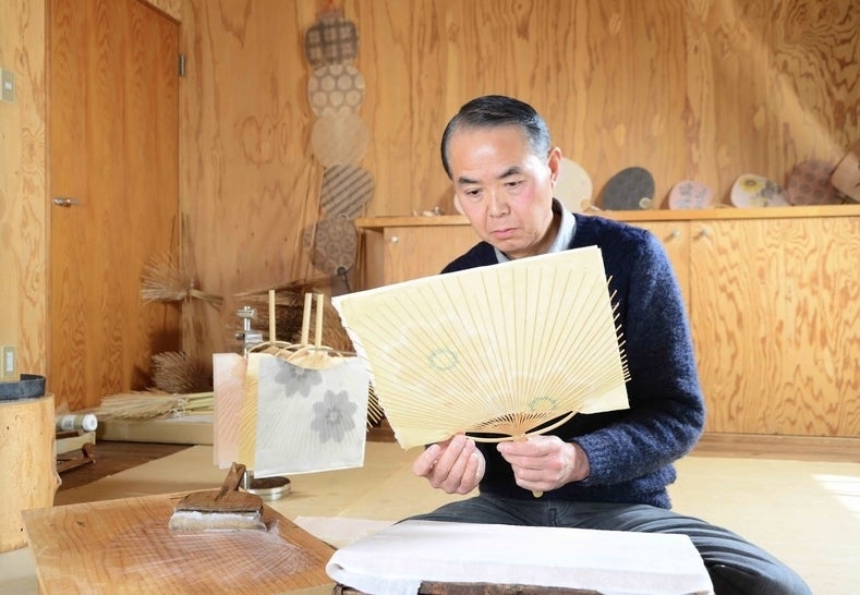 甲斐絹のうちわを製作中の杉山江見堂・杉山茂さん