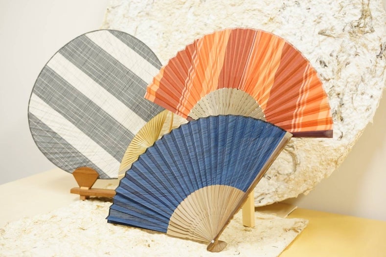 細い糸によって高密度に織られた絹100%の生地を用いたうちわ・扇子は甲斐絹の特長を生かし、軽く、しなやかな風がそよぐ作品に仕上がりました。