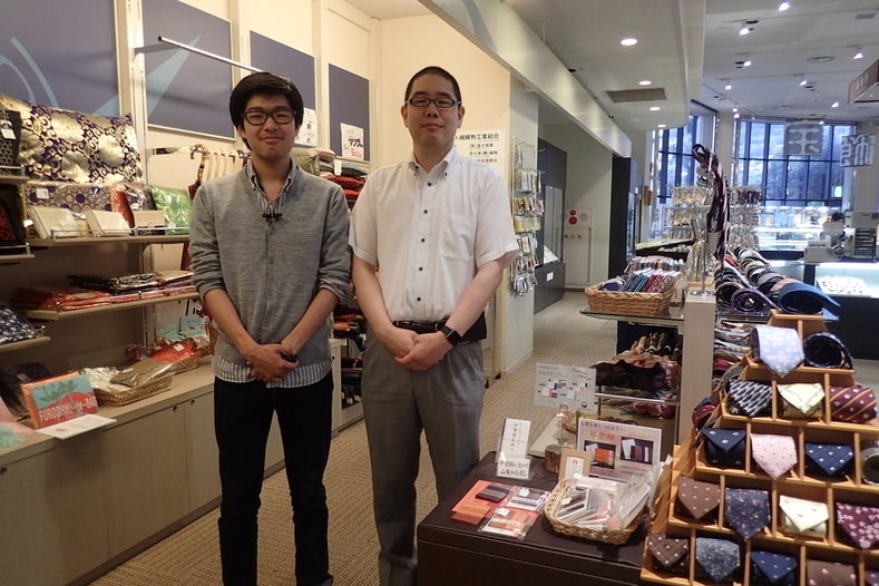 かいてらす(山梨県地場産業センター)業務係長の中山豪人さん:写真右 と甲斐絹堂 中川