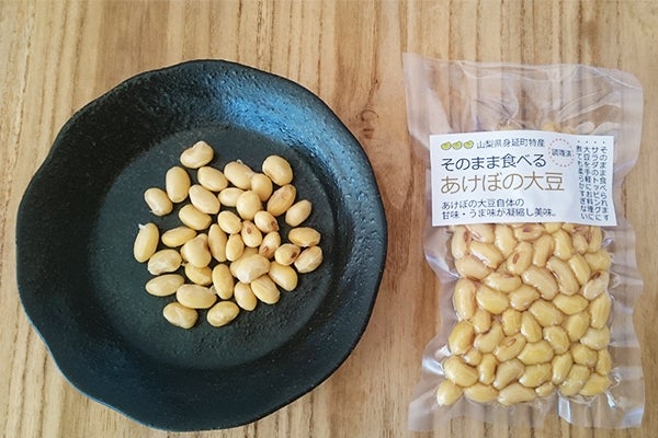 あけぼの大豆の乾燥大豆はまだですか?とお問い合わせが増える時期です。早い方には10月頃。一般的な大豆が出てくるとあけぼの大豆もそろそろかなと思われるようです。 産地の身延町内では、12月~1月に収穫し、天日干し、脱粒し、粒で乾燥、選別を行い大体2月に出荷となります。 私どもは、年末年始のご要望が多いので収穫し、畑での天日干しを始めました。今年は、大豆が枯れるのが遅く、例年より遅いスタートですが何とか年末ぎりぎりには出荷できるようにと作業しています。 あけぼの大豆乾燥大豆もリピーターさんが多く、まず水に浸すとその大きさにびっくりされます。そして煮たり蒸したりして食べたときに味わいにもその甘さ、旨みでファンになっていただいています。 近年、大豆を煮たり蒸したりの調理をされる方が減っていることとあけぼの大豆の味わいを濃厚に味わっていただきたいという思いで、蒸したり煮たりせず、あけぼの大豆の味わいを逃がさず閉じ込める製法を開発し、濃厚に味わえる「そのまま食べる大豆」を販売中です。 開封してそのまま食べることができます。調理に使おうと開封して、味見しているうちにとまらなくなり結構食べてしまうということを良く耳にします。サラダのほかカレーのトッピングなど人気です。スープや煮込み料理も煮崩れせず、手軽に美味しく大豆を食べられるとお料理をお楽しみいただいています。 乾燥大豆の出荷とともに新大豆を使ったそのまま食べる大豆も製造します。 乾燥大豆とそのまま食べる大豆もあけぼの大豆頒布の3回の中に含まれますので是非ご賞味ください