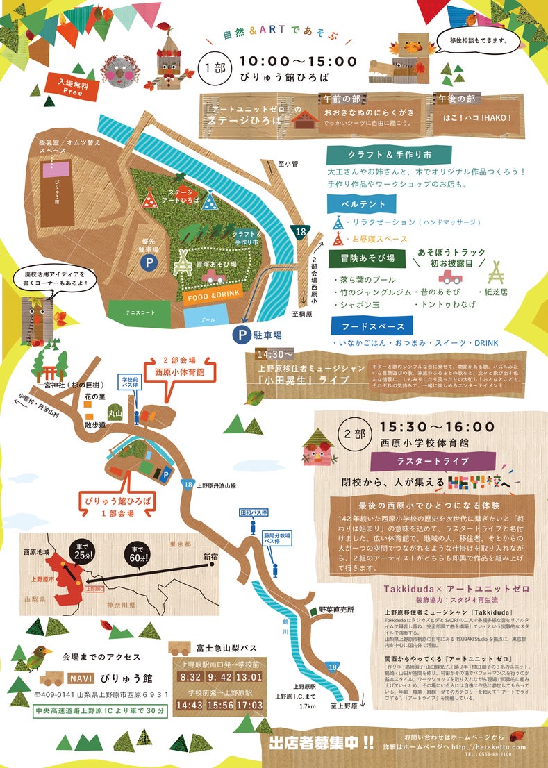 地域の方も遠くから見える方も、小さなお子様もご年配の方も、気軽にきてもらえたらと、イベントや駐車場のお金を無料にしています。また、第一部もたくさんのワークショップや体験ができるよう多くの人と日数をかけて形にします。第二部も、アーティストは移住者だけでなく関西や都内からも打ち合わせを何回も重ねた上でイベントにかけつけてくれます。