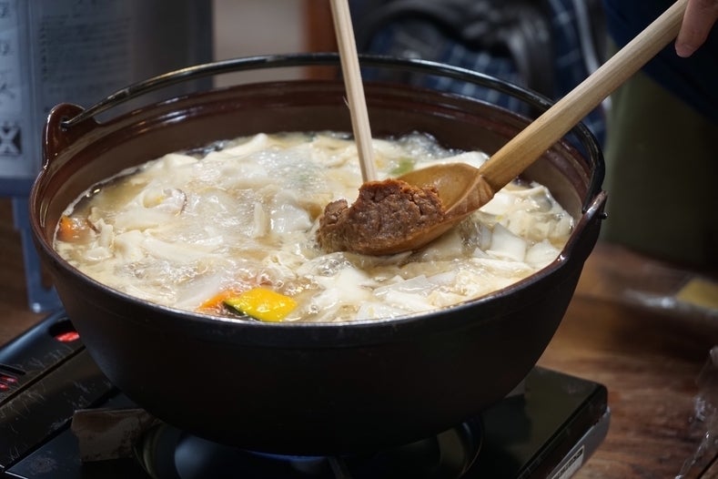 この集落では、昔から人々が集まる冠婚葬祭や元旦の日にみみが振舞われてきました。みみは、たっぷりのお味噌と煮干しのおだしで味付けられた汁に、大根や人参などの野菜と、小麦粉から練ったみみを投入し、グツグツと煮込んだ料理のことです。