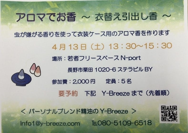 3/12のレポートでアロマ香のお話をしましたが、その後お問合せを多くいただき本当にありがとうございます。皆さまのご要望にお応えして、衣替えに役立つ「アロマのお香」を作るワークショップをご用意いたしましたので、お知らせします。