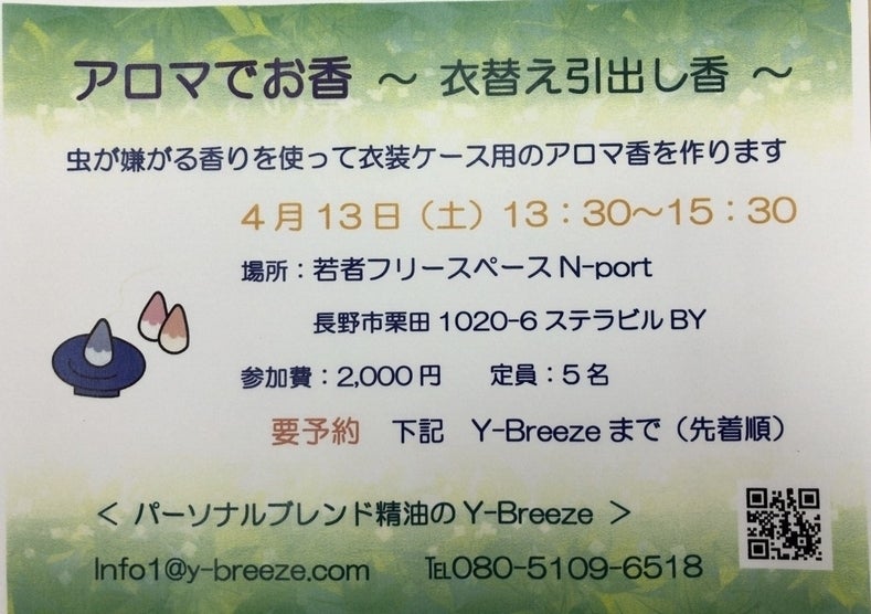 3/12のレポートでアロマ香のお話をしましたが、その後お問合せを多くいただき本当にありがとうございます。皆さまのご要望にお応えして、衣替えに役立つ「アロマのお香」を作るワークショップをご用意いたしましたので、お知らせします。 和のお香では、タブ粉と言われれる繋ぎの粉に、香りの原料(粉末)を加えて作りますが、今回は洋のお香作りをします。 和のお香の粉末原料に代わって、洋のお香ではアロマオイルやドライハーブ、ドライパウダーを使います。作り方はいたって簡単で、繋ぎのタブ粉に虫の嫌がるアロマオイルやハーブを入れて良く練り、平らにしてから型抜きをして十分乾燥させたら和紙などに包みます。これで出来上がりです!写真は円錐型のアロマ香を作ろうと努力したのですが、どうも不器用でいけません(笑) 虫が嫌がる香りの代表的なものは、レモングラス、ユーカリ、シトロネラ、ラベンダー、クローブなど。ドライハーブはローズマリーとレモングラスを細かく擦ったり刻んだりして使います。機械で擦りあげるわけではないので少し植物の繊維が残りますが、香りには特に影響はありません。 さあ、ご一緒にいかがですか?今年から「衣類の虫よけ」が不要になりますよ!(先着5名様となります) ご予約は info1@y-breeze.com 或いは TEL080-5109-6518 までご連絡ください!