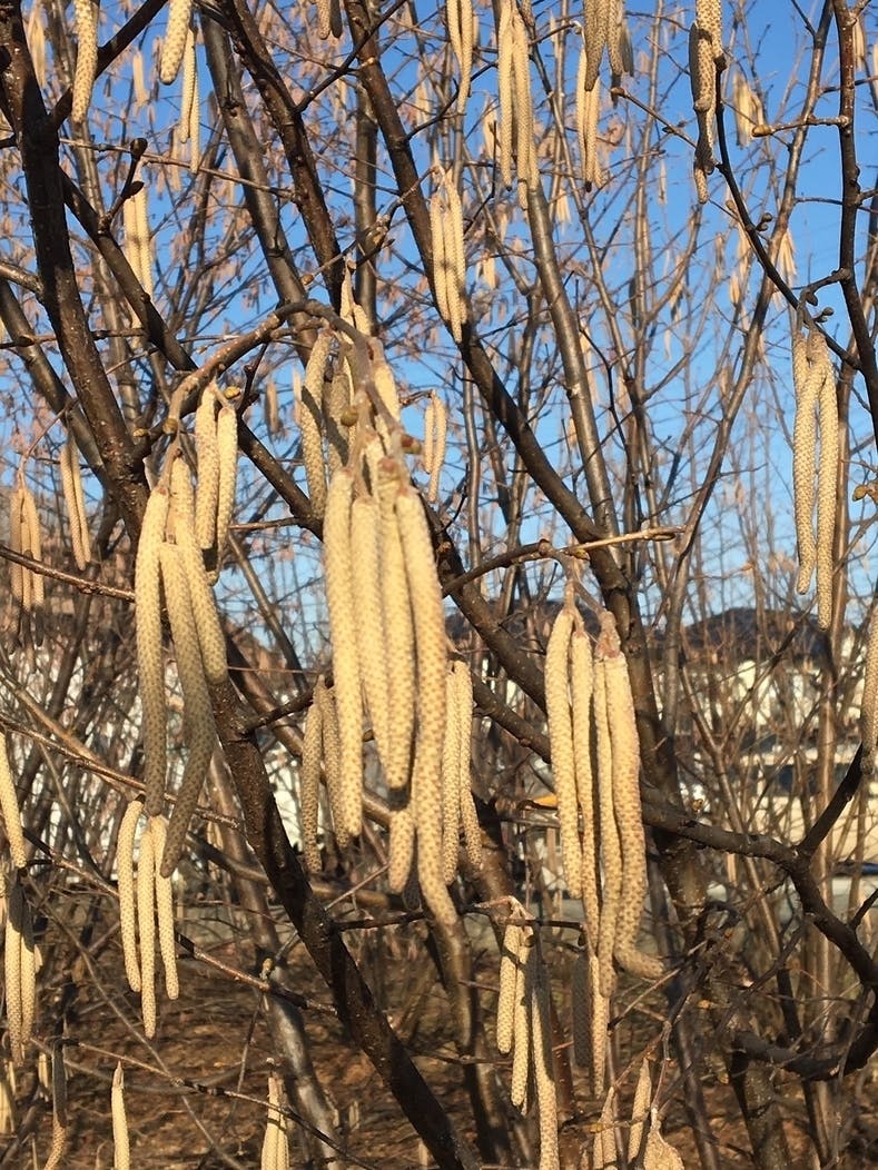 ヘーゼルナッツの雄花は画像のように硬い花のまま冬を越します。