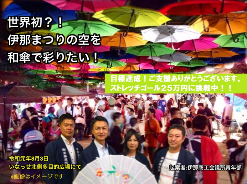 今回は令和元年8月3日に伊那市で行われる「伊那まつり」において、和傘によるアンブレラスカイ『和傘ンブレラスカイ』実現のための資金支援をいただきたく、私たちの「想い」を紹介させていただきます。