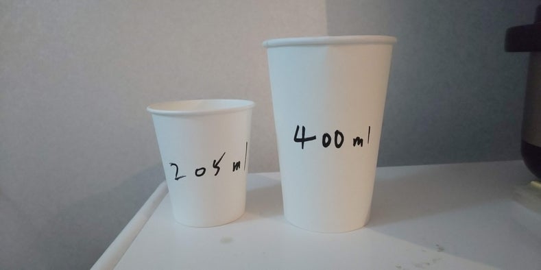 「全部飲みたい!」と思うお客様もいらっしゃるかもしれないので、その問題を解決するためにLサイズとMサイズのコップを販売します。もちろん小っちゃいほうは値段が安くなりますよ。゚+.(ฺ ωฺ )゚+
