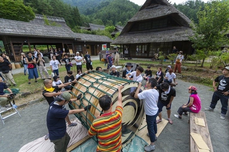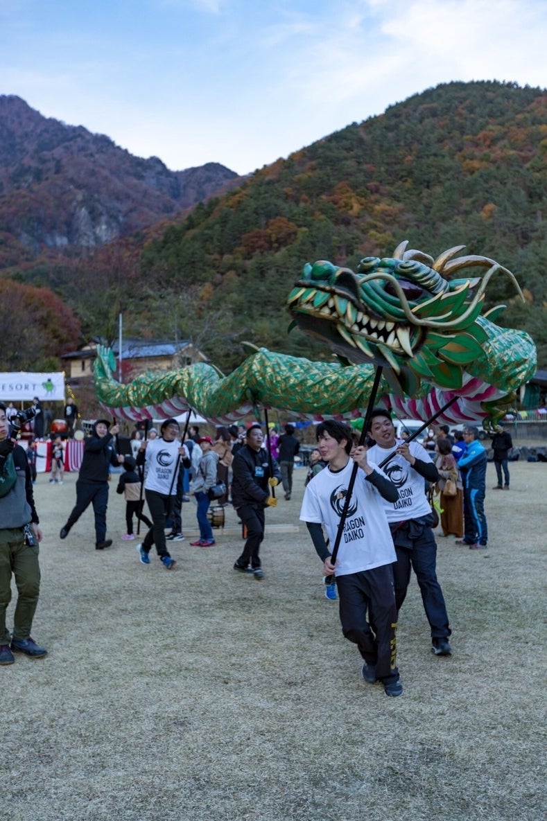 フィナーレではこの地域の木材で作り上げた5尺5寸の大太鼓『ドラゴン太鼓』を参加者全員で担ぎ上げ、子供達は舞い踊り、打ち鳴らしボーダレスで壮大な演舞を行います。