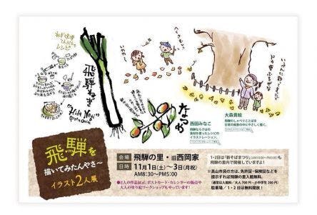 11月1〜3日の3日間、 高山市の飛騨の里にてイラスト展を開催します。 高山在住の女性イラストレーター2人による 「飛騨を描いてみたんやさ〜イラスト2人展」 西田みなこ/大森貴絵(たかんこ) 会場:飛騨の里・旧西岡家 tel:0577-34-4711 日時:11月1日(土)〜3日(月祝) AM8:30〜PM5:00 塗り絵ワークショップも開催 随時受付(300円) 入館料: 高山市民の方は無料(免許証・保険証などを提示下さい) (通常は入館料/大人700円・小中学生200円) 駐車場は1・2日は無料開放。 私からは、「四季」をテーマに飛騨弁イラストを展示させていただきます。 先輩イラストレーター・西田みなこさんの 「飛騨のめぐみレシピカード」には美味しそうなレシピがいっぱい。 ポストカードやカレンダーなどの販売や塗り絵ワークショップも。 そして1〜2日は「新そば祭」も開催中。 紅葉も見頃でお楽しみいっぱいです。 本の制作作業も最終段階に入っています。 一足先に、飛騨弁イラストの展示をご覧下さい。 プロジェクトもあと5日! 最後までがんばります!
