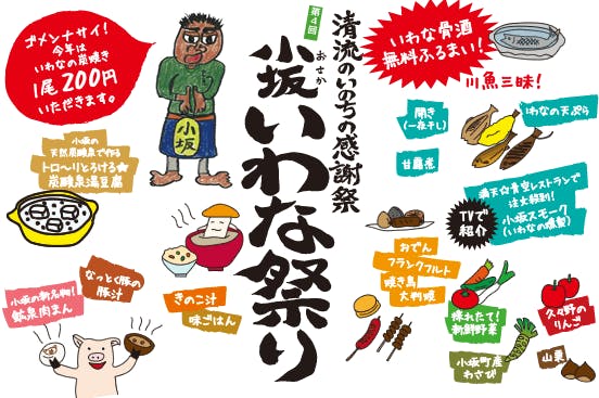 毎日の生活で疲れている方、心が疲れている方。小坂の自然の中で、自然の恵みをいっぱい受けて、リフレッシュしてください!ぜひ、小坂のいわな祭りに足をお運びください。この地ならではのおもてなしで、楽しい1日を過ごして頂けるよう、お祭りを開催します!