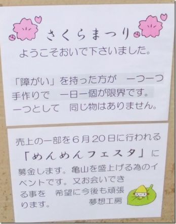 4月5日(日)に行われた亀山城の「桜まつり」で、施設の女性から、手づくりの紙挟みの作品を販売した売上の一部を、「福祉のめんめんフェスタ2015」にご寄付いただきました。