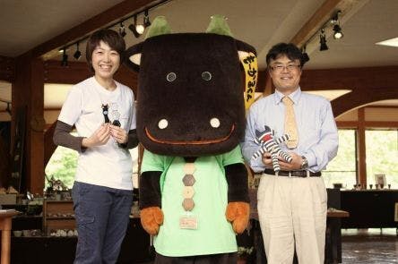今日は「も~かるくん」の生みの親、育ての親である!?「ひだ清見観光協会」のスタッフさんとともに、NOKUTIEとプロジェクトTシャツを試着していただいてのスリーショット!